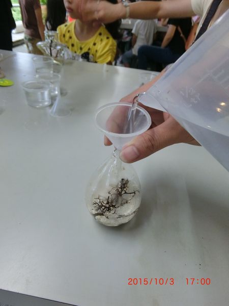 接著解說人員會拿出準備好的海水,透過小漏斗輔助器,讓海水順流到瓶中