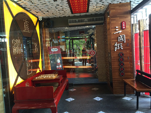 這間餐廳的造景很漂亮,用餐環境非常的古色古香,餐廳旁有竹林、巨大的棋盤、還有超美的水幕;餐廳內有古色古香的桌椅、字畫、屏風帷幕、葡萄酒瓶堆飾的氣泡水族箱(但裡面沒有魚),還有眾多三國英雄的雕像與妳一同用餐,環境也維持的非常乾淨~