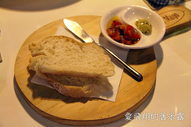 法國麵包~外酥脆內軟的口感,咀嚼有淡淡澱粉香氣,沾上綠色沙沙醬(奶油與秘密香料),有一種特殊香草美味,咀嚼很耐人尋味;另外番茄橄欖醬酸酸的水果香氣充滿口中,滿入口好吃的。