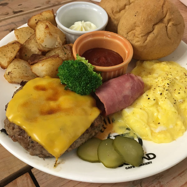 輕食主角隨後就到,附餐麵包選的是自以為比較健康想減低罪惡感的全麥餐包,整份餐還有起司蛋、培根、我喜歡的帶皮馬鈴薯切塊,蓋著起司棉被的就是厚實多汁手打漢堡排啦~有煎烤的香氣,口感紮實滿足卻也飽含肉汁,不油膩不乾澀,好吃。