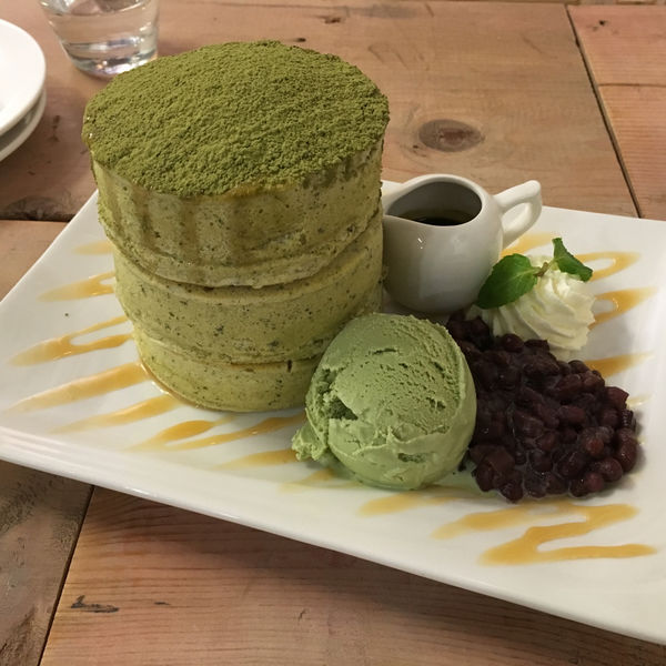 陪襯的紅豆也好吃,相較之下,那球比較普通的抹茶冰淇淋就可惜了點,但不重要!因為這抹茶厚鬆餅真的太得我心了!大推!<3 <3 ❤️