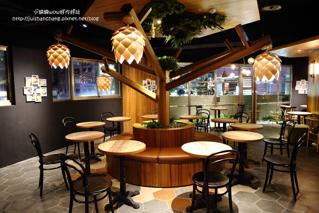 宛如在擁抱自然、玩味幾何的概念裡,打造一座探索視覺原味的森林系—佐妝蜂巢狀獨特地磚,以棕褐原木作為90%建材、與歐風擺設完美相契,座落於二樓的原木大樹,密覆著似會呼吸的優雅綠意,枝幹末梢更懸上米色松果吊燈,當陽光折射或啟亮燈飾,就像現代小森林一般。