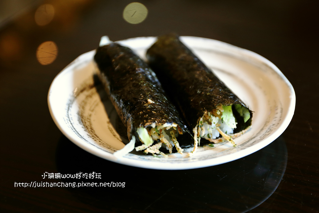 炸牛蒡絲手卷,海苔、牛蒡絲都超脆,一口咬下口感非常棒,好酥脆呀,很清爽很好吃 !
