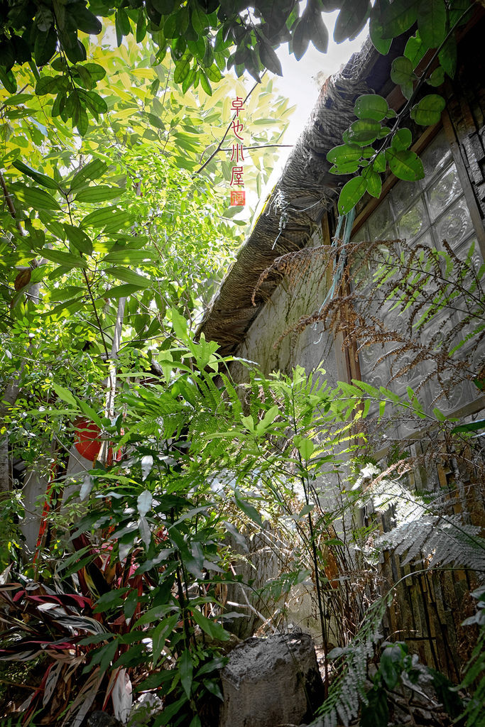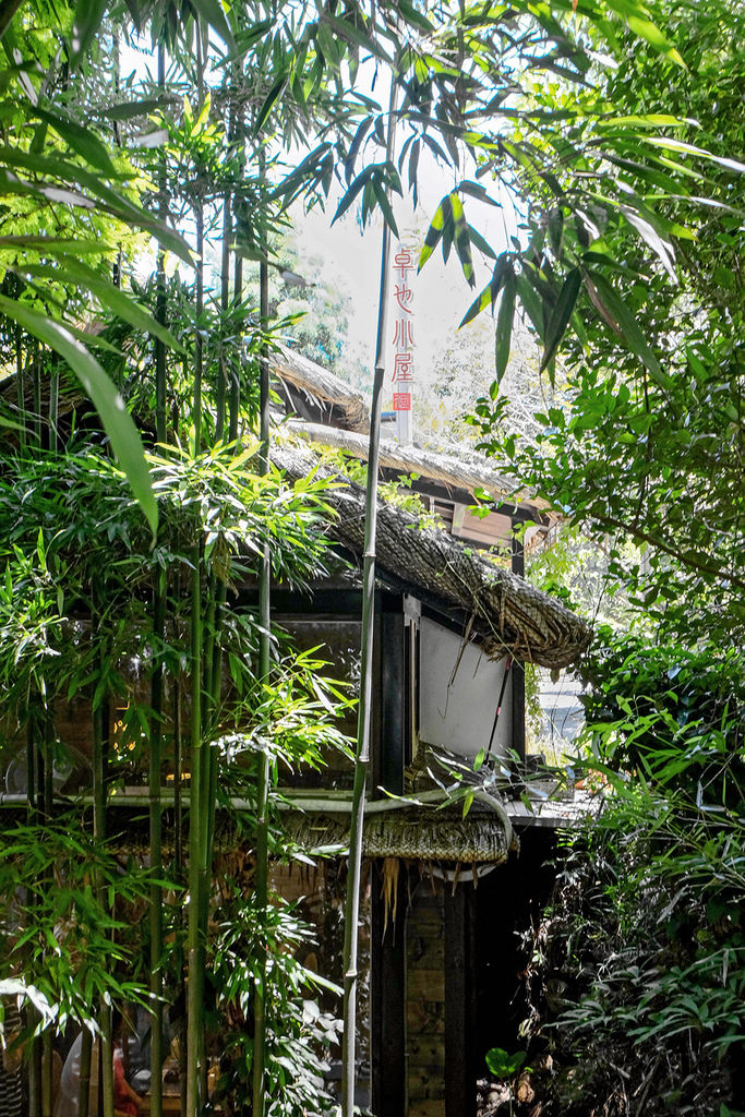木製的窗格、竹子搭建的牆壁和天花板、配上藤製的燈罩、座椅