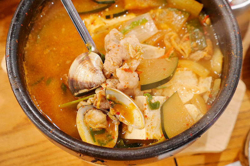特別是那個辣味相當韓國..裡面有蛤蜊、豆腐、牛肉、年糕等等..還有附上一碗拌飯..