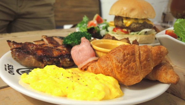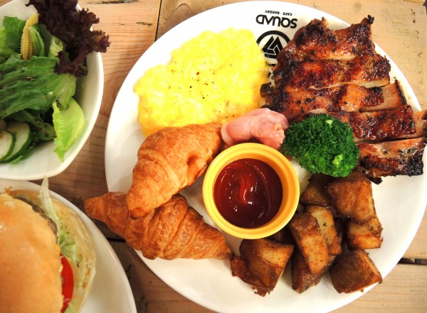 上面包含麵包、馬鈴薯、炒蛋、培根、花椰菜及雞腿排。而麵包部分可頌、全麥餐包、法式切片三選一,這次選了帶點酥脆香氣又不會太過油的可頌,吃起來普通。