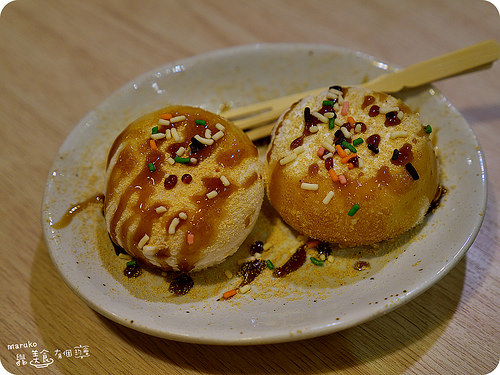 明太子沙拉淋在上層有一點邪惡,軟嫩的玉子燒咬著還有湯汁加分不少,不過如果是原味的蛋香