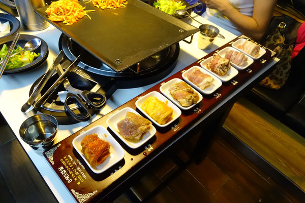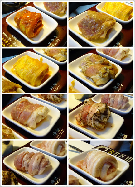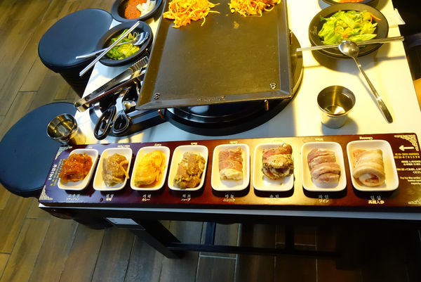 八色豬上桌,依序放到鐵盤烤 味道由淡➡濃 (下圖照片由右至左)