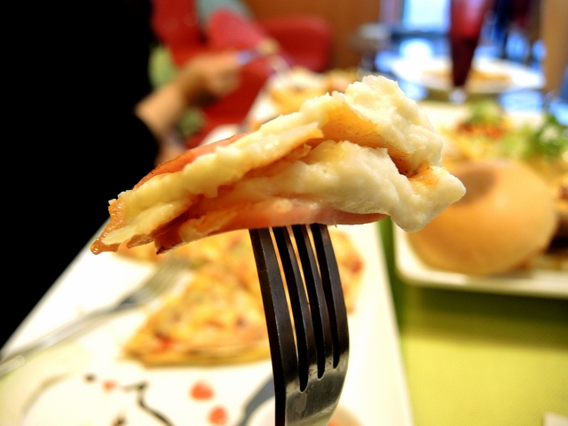 焗薯泥火腿:自製創意改良,火腿上加入自製薯泥+PIZZA乳酪絲在一起焗烤,薯泥把火腿的油膩蓋住了,變得比較爽口,乳酪絲的香氣也蓋住一點火腿原有的膩味,讓女生會比較願意嘗試吃!