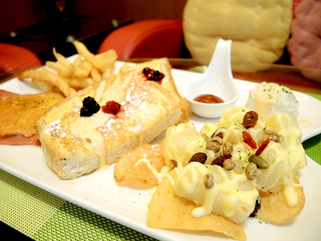 鮮蔬沙拉/芒香煉乳麻糬 (二擇一):這次點的是後者,麻糬下面的洋芋片,吃起來不油膩,而上面的麻糬淋上自製的芒香煉乳醬,淡淡的芒果香讓在咬嚼麻糬時,多了份香氣。