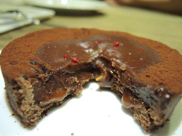 咬第一口,整個完全讓我愛上了>< 入口瞬間那種帶點苦甜的滋味,外層酥脆的香氣加上富有層次感的口感,還有杏仁片和臻果的陪襯,連不愛巧克力的露易絲也愛上了它 ! 巧克力帶點焦糖的滑順口感,愈吃愈順口,喜歡這道,除了它的層次感,還有它沒有巧克力的苦澀及膩感阿!!!!!