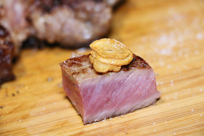 整塊勒眼牛排已經切成骰子狀