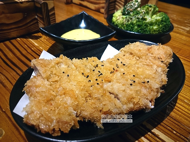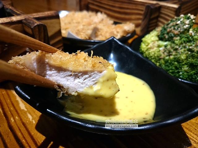 ▼先來沾一下蜂蜜芥茉醬吃吃看~麵衣脆脆香香的豬排肉很扎實多汁~安魯魯覺得這個豬排已經快搶走主餐 鍋燒麵的丰采了!!