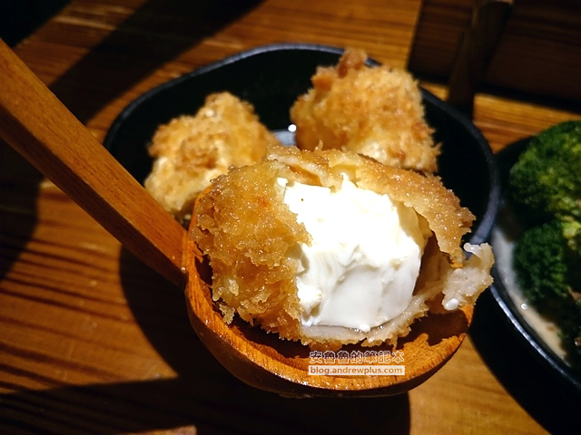 炸雞塊一上桌也是令人食指大動,和炸豬排不太一樣的麵衣顏色,外皮偏紅色,看起來應該是有醃漬過才會有的色澤!