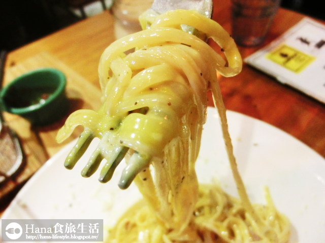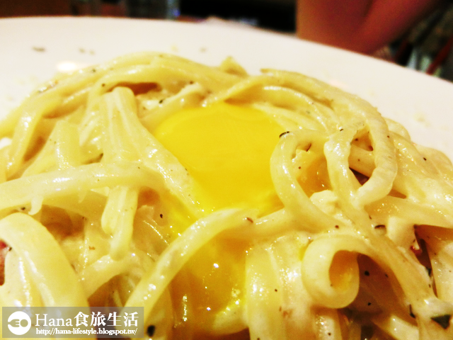 ▲卡布那拉奶油培根蛋黃義大利麵$210,這邊使用的是寬扁麵,