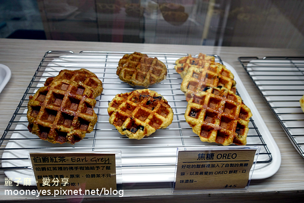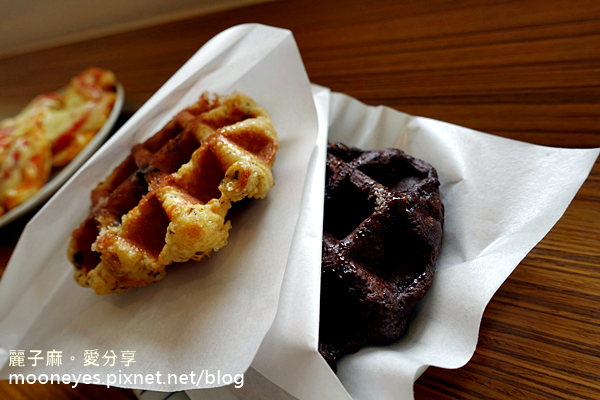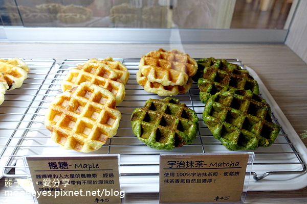 因為店家使用的是發酵過的麵團,而不是麵糊喔,把各種口味的材料都菸揉入麵團中,等待發酵,會做麵包等點心料理的都知道,麵糰發酵有一定的時間,發酵時間一到一定要處理起來,才不會因為發酵過頭影響口感,店家使用的就是這個工法,所以鬆餅的口感並不會因為放在冰櫃裡就受影響,只要稍微加熱一下,就跟剛出爐的一樣好吃哦!現烤、常溫、外帶回烤也不改變的美味。真的是超厲害的。我一直以為鬆餅一定要用麵糊現做耶~
