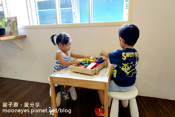 更棒的是,有帶小朋友的家長也不用擔心孩子在這裡會無聊,店主人準備了很棒的遊戲桌,讓小朋友可以在這裡玩積木,那張桌子又讓麗子麻想帶回家了(喂,怎麼甚麼都想帶回去呢?)