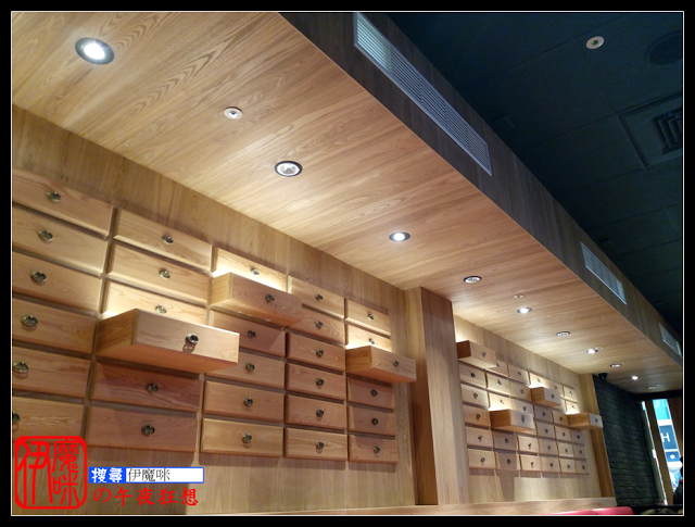 牆上的裝飾蠻特別的,是類似中藥店的抽屜,抽屜裏面有燈當作照明,就是不知道是不是每個抽屜都有,如果每個抽屜都可以拉開,偶爾就可以改變拉開的抽屜,這樣的設計頗是趣味。