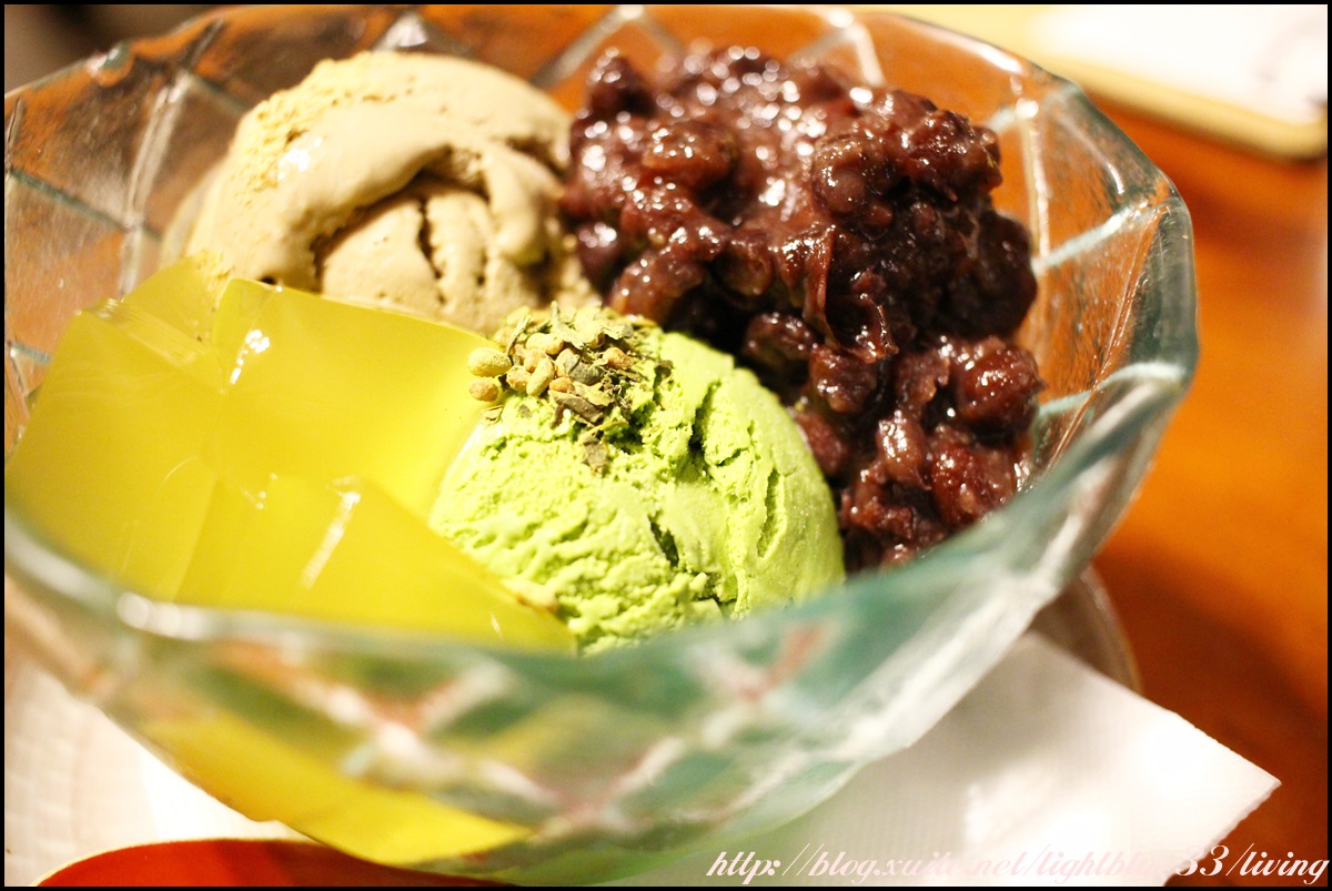 三味茶是抹茶冰淇淋、焙茶冰淇淋、煎茶茶凍,還有一球紅豆泥