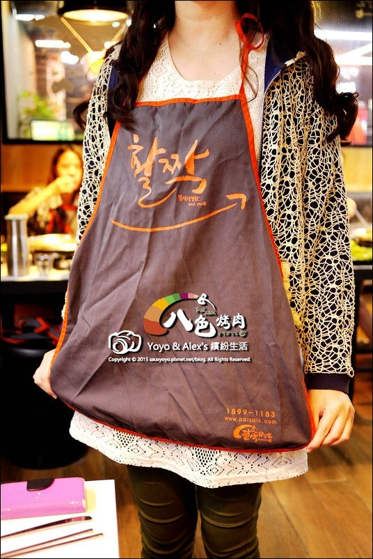 餐具與衛生紙都放在座位的抽屜中,而八色烤肉也提供圍兜兜給客人,穿法就交給 yoyo 示範了~XD。