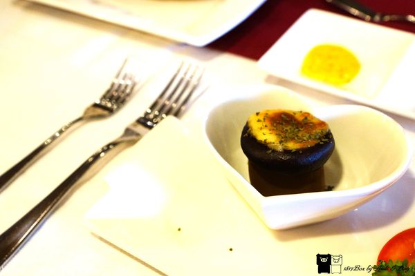 野菇焗烤是將大顆香菇加上起司烘烤,香菇的鮮甜都鎖在裡面,很好吃。