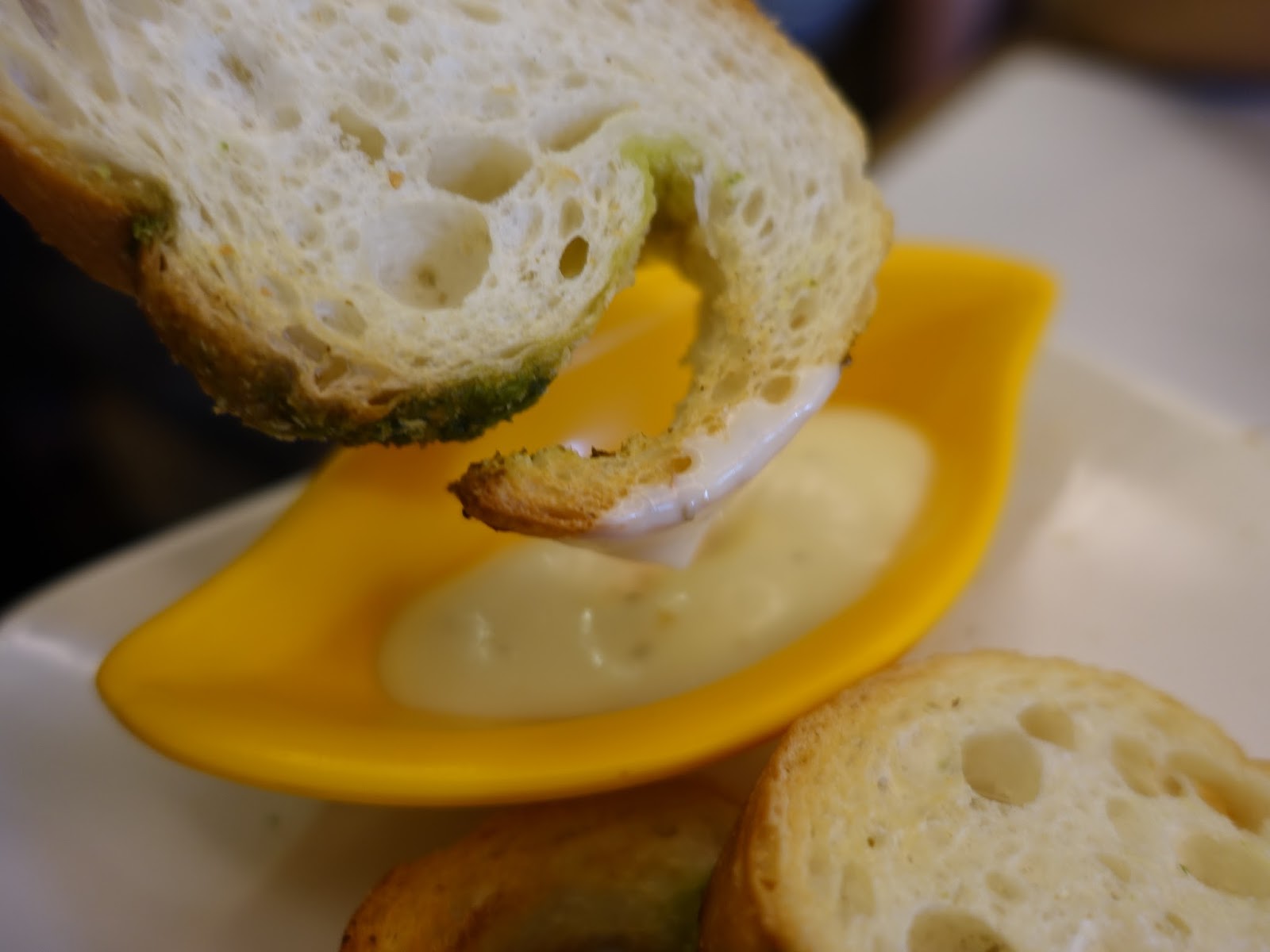 蒜香麵包可以沾著旁邊的甜白醬汁,更加美味,沾著濃湯吃也很棒!
