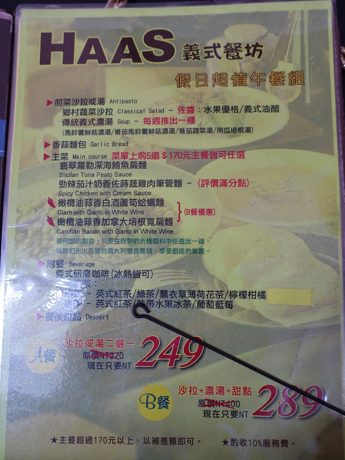 服務一樣很好,老闆娘的親切和氣模樣如昔,店員以為我沒有來過,又詳細的介紹了一次套餐的組合,套餐價格也和以前一樣都沒有變,點了兩份義大利麵的A套餐,可以選擇濃湯或沙拉,點完餐後很快的濃湯和麵包就率先上桌囉!每週的濃湯都不一樣,這週的是馬鈴薯鮮菇濃湯!