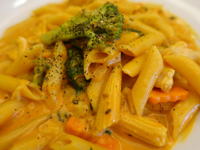 這份勁辣茄汁奶香佐時蔬雞肉筆管麵,雖然已囑咐要做小辣,吃起來還是蠻辣的,不敢吃辣的人可不能嘗試,帶著茄香的濃稠奶油醬汁裹滿煮得彈性剛好的筆管麵,相當過癮好吃!雞肉是新鮮的雞胸肉去煮的,相當滑嫩,吃了就知道為什麼菜單上面特別註明評價滿分點,果然好吃,而且份量不小!