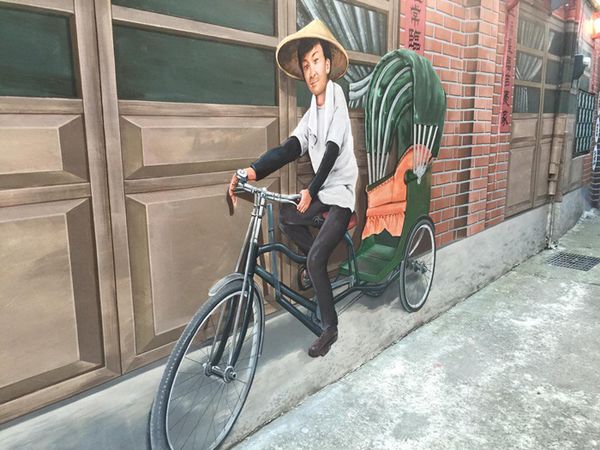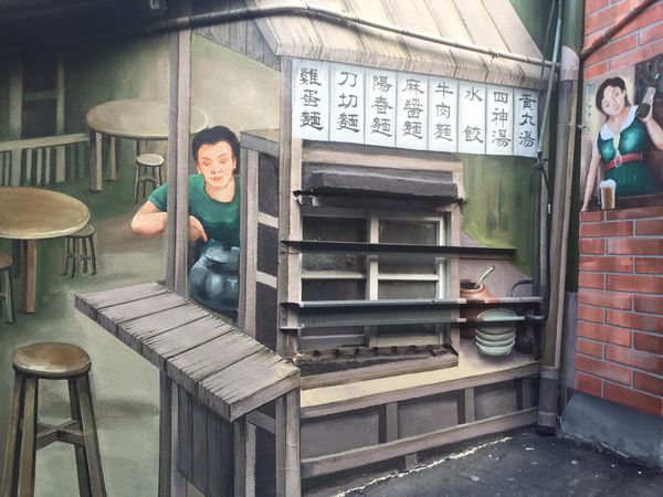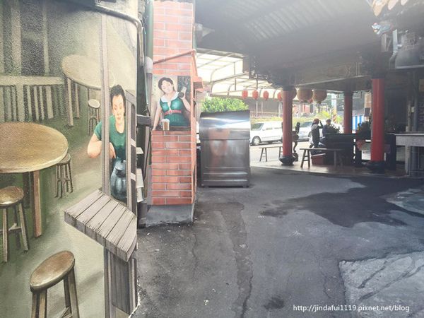 ▲好像很多人以為美仁里的彩繪牆就只有雜貨店和水果攤這兩塊區域,我和友人就是其中之二,當天以為這樣就沒了便掉頭騎車回台中。但我當晚滑Instagram看別人在美仁里的貼文發現居然有人po出我們沒看見的彩繪牆,ˋ圖為一個阿伯騎人力車的模樣,我瞬間臉歪瞬間晴天霹靂久久不能自己,世上最遙遠的距離不是我在妳面前而妳不知道我愛你,而是我們明明已經到了美仁里卻完全錯過你!身為一個有點強迫症的人豈能容許這種事發生,豈能容許自己的遊記不完整,能嗎能嗎能嗎?absolutely NOT!!!!!!!!!!!!! 因此我隔天清晨六點多又騎車騎了一個小時飆到沙鹿尋找那個阿伯,果真被我找到了,他就在雜貨店那邊的窄巷直直走,後來找完阿伯心想為求保險還是在附近隨意亂晃一下,果真轉進雜貨店旁的路再走一小段又發現一面彩繪牆,是麵攤的樣貌(超慶幸我有隨意的閒晃,不然我可能就要因此三訪美仁里了....)