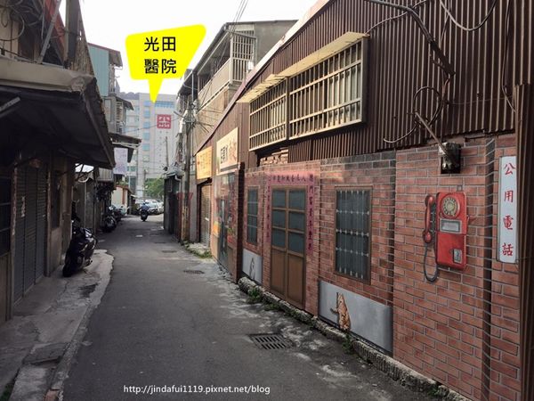 ▲我們那天選擇先直走至水果攤這邊,瞧瞧往回頭可以看見光田醫院在正對面,顯然只要認明光田醫院這個大地標就很容易尋獲此彩繪巷芳蹤