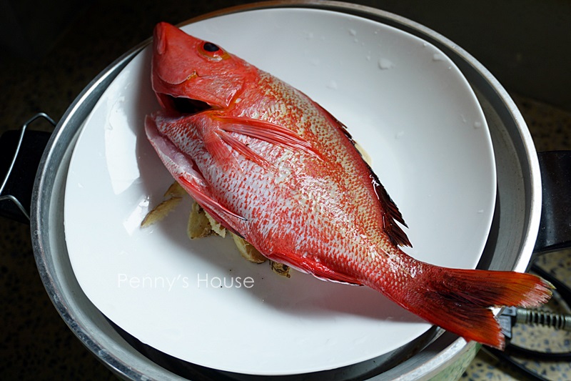 下面墊上薑片,魚身上抹鹽,送入電鍋蒸。