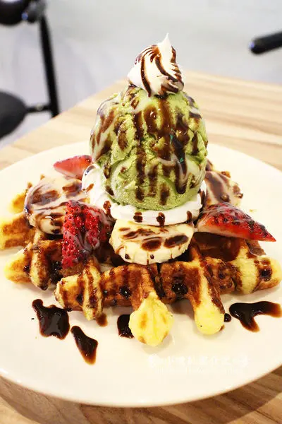 香蕉巧醬冰淇淋110元.道地比利時鬆餅搭配現切香蕉片.HERSHEY'S巧克力醬