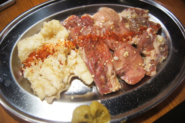 這道可以說是牛雜的拼盤,店家處理得非常好,完全沒有奇怪的味道。本來以為小腸(左上)是咬不動的口感,其實不會喔,服務生說只要有烤熟就不會咬不動,很好咀嚼,我超愛的。