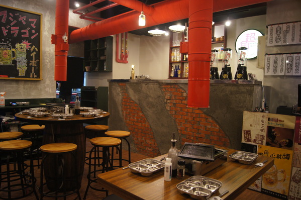 橡木桶改造成的餐桌搭配高腳椅超有特色的,餐桌上紅色管子則是抽風機,讓你一邊用餐也不會煙霧瀰漫!!