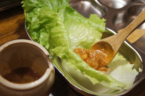 包入鹹中帶甜的肉醬味噌,搭配泡菜、大蒜、小黃瓜、豆芽菜以及口感清爽的生菜,隨著不同的組合搭配,感受不一樣的美味與口感。