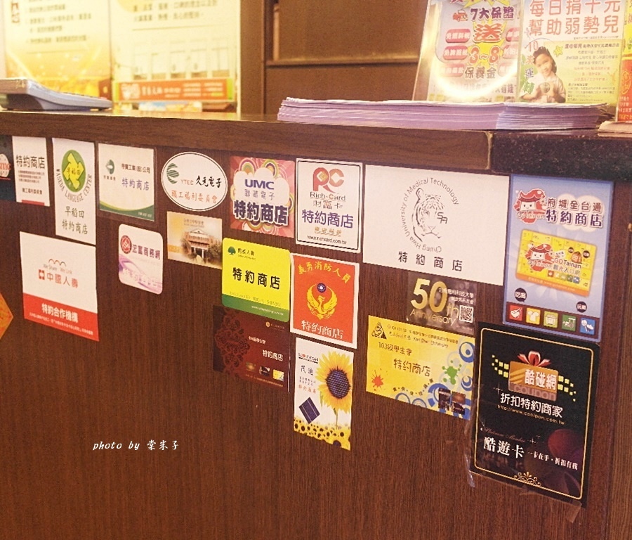 而一旁櫃檯上則是貼滿了和店家合作的團體,