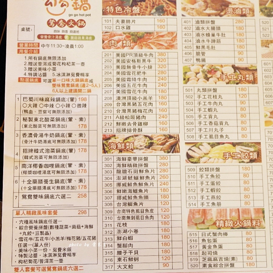 店裡鍋底有麻辣鍋、酸菜鍋、牛奶鍋、韓式泡菜鍋、南洋咖哩鍋、養生鍋6種,