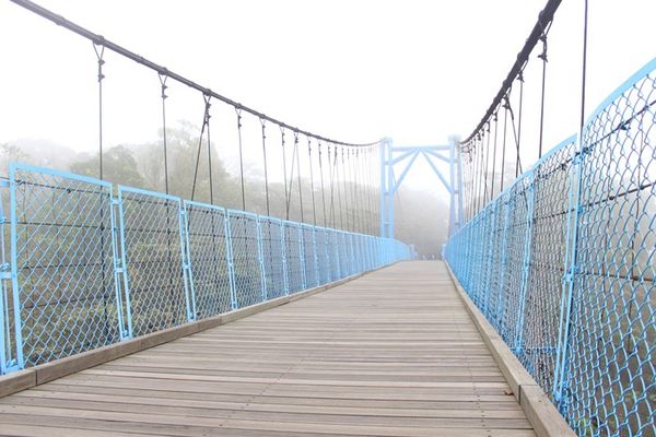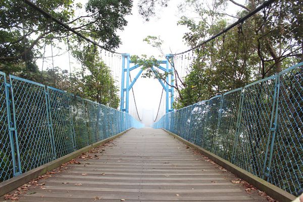 ▲走著走著不知不覺就抵達了九湖天空之橋,那日天公不肯作美,整個苗栗天空灰濛濛的,往橋的前方望去,有種要進入雲深不知處的仙境感(撫鬚)
