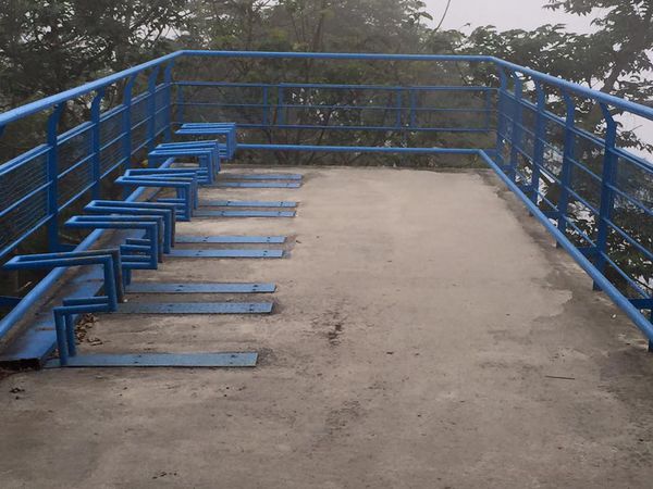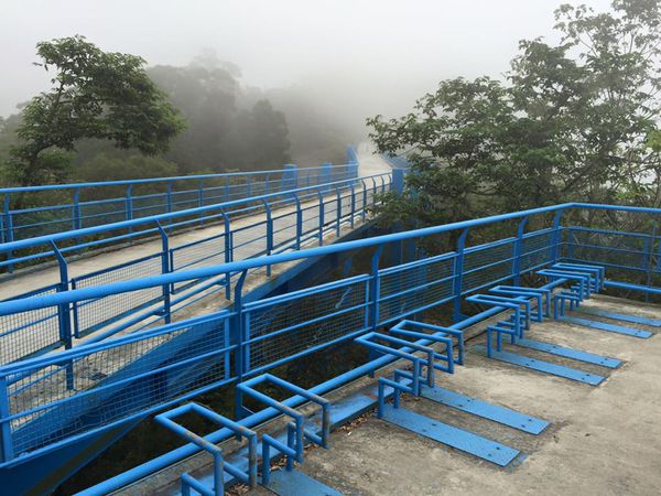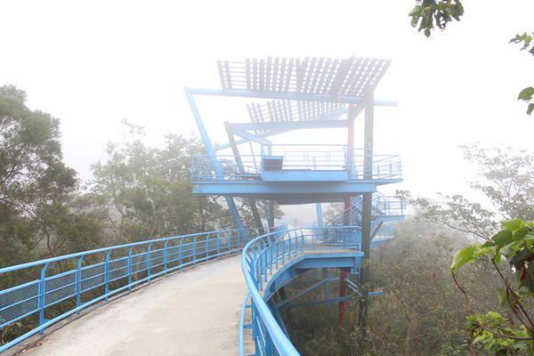 ▲天空之橋亦是自行車道,號稱全台最美兼最高的自行車道,橫跨山谷的自行車道僅限腳踏車與行人通行。銅鑼九湖自行車道,以環型車道設計的路線全長大約8公里,位虎頭崁古道與挑鹽古道之間,沿著九華山稜線修築,曾有來此一騎的網友表示油桐花季節時,在此可俯瞰油桐花海,就像被白雪覆蓋一樣,美不勝收。可惜我們那天沒有「霧裡看花」,而是甚麼都看不到阿~~~~XD 我們經歷的是霧鎖山城的意境,1817姊認為這也是一種美好的體驗(她是很正面樂觀的人,真心覺得這樣很棒!)。