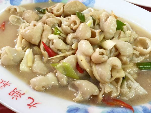 ▲薑絲炒大腸,同桌的長輩特別溫馨小叮嚀我這要趁早吃,不然放久吃起來會像在吃橡皮筋。這吃起來會有一股酸勁,理事長說因為起鍋前才加醋的,還滿對個人的味的,是好吃的酸味,但若是不太敢吃酸的人可能要自行斟酌一下是否要夾進五臟廟囉