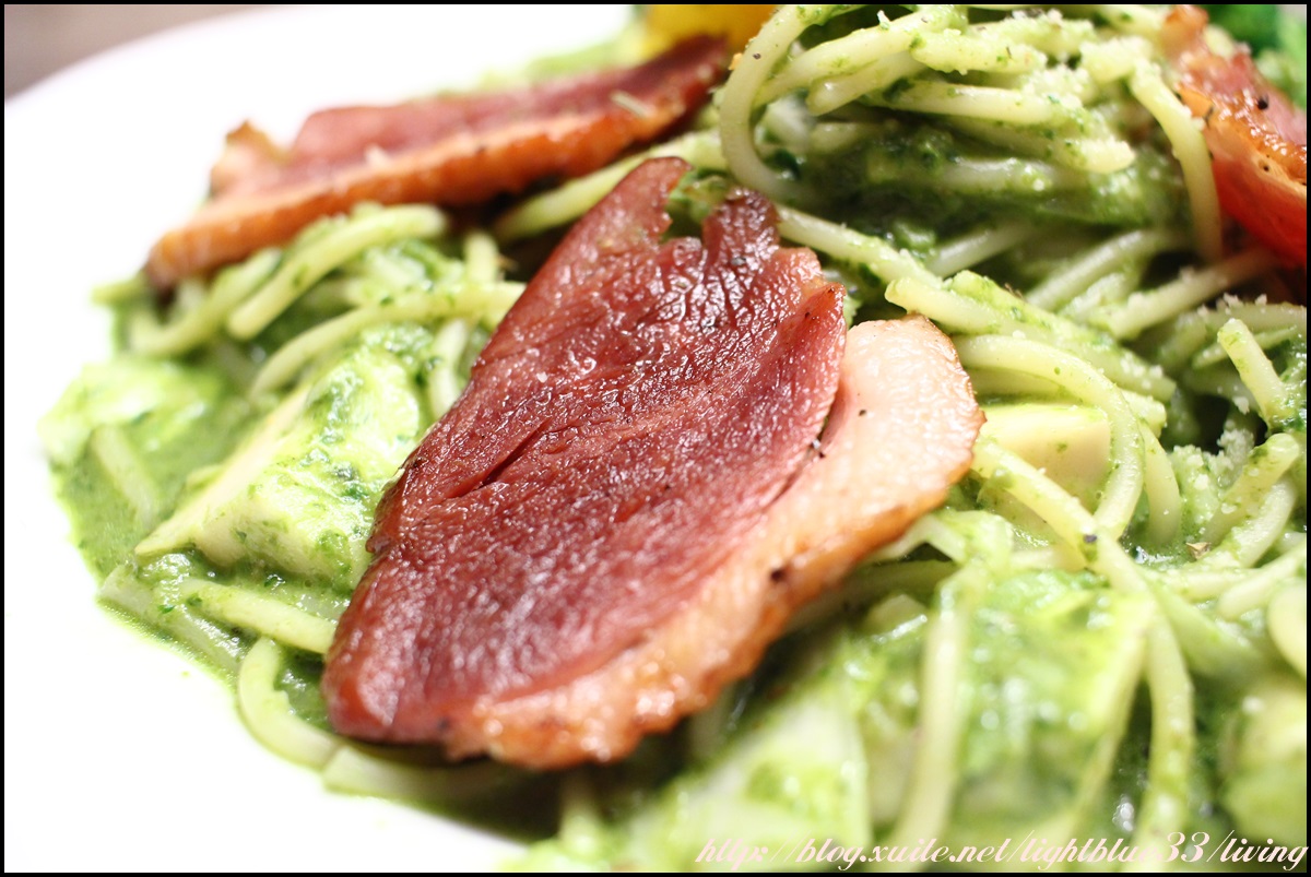 這是青醬櫻桃鴨義大利麵,青醬非常真材實料,可以看得到碎末,都巴附在麵條上,一入口並不會有很重口味的衝擊,但是咀嚼後香味跟大蒜味就會跟著跑出來,還有好多洋蔥跟杏鮑菇,可以吃到好多蔬菜