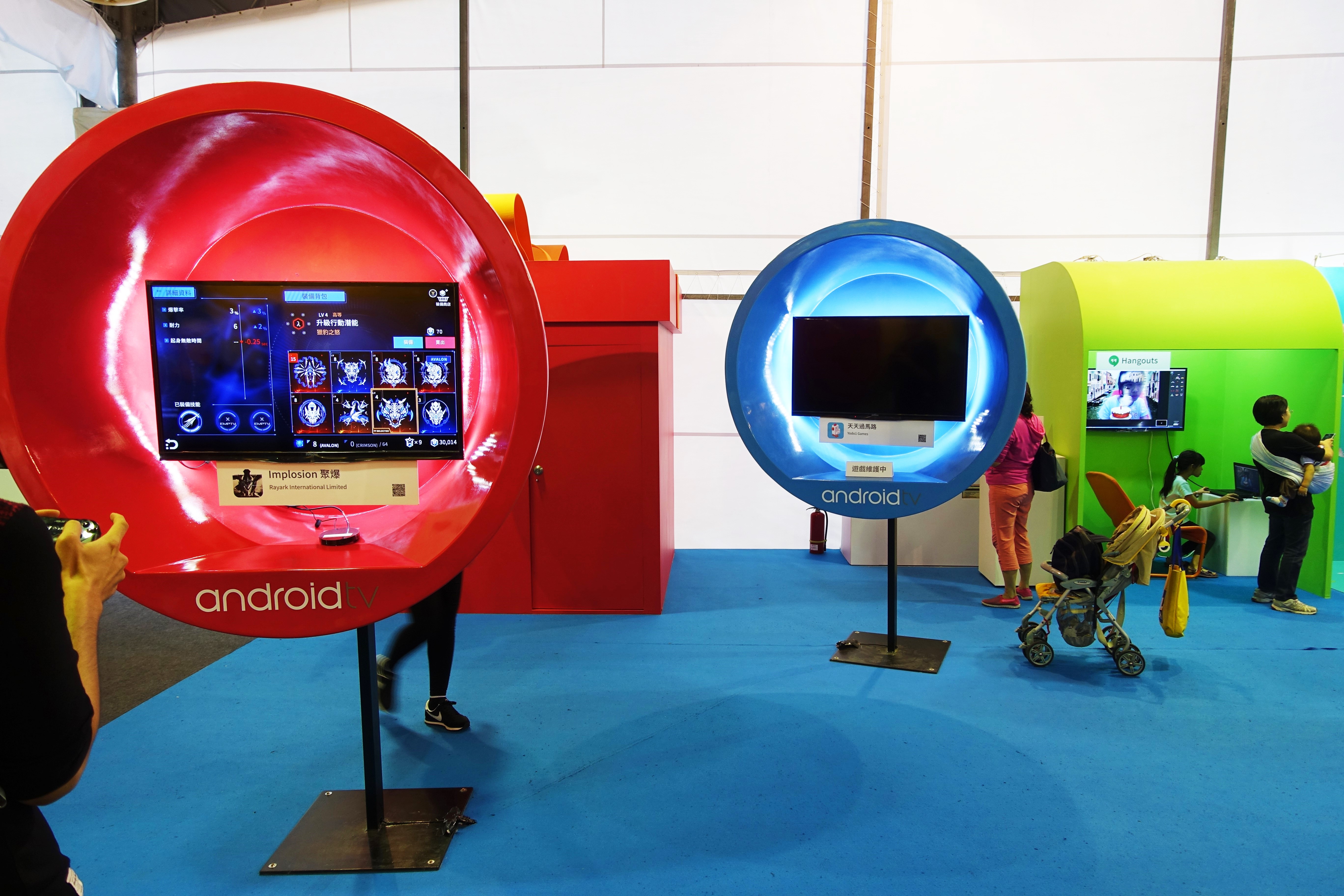 藍色區域一樣是體驗遊戲,由左至右分別是:跳舞遊戲(Just Dance Now)、網球遊戲(Motion Tennis Cast)、開車遊戲(Beach Buggy Racing)與炸彈遊戲(BombSquad)。