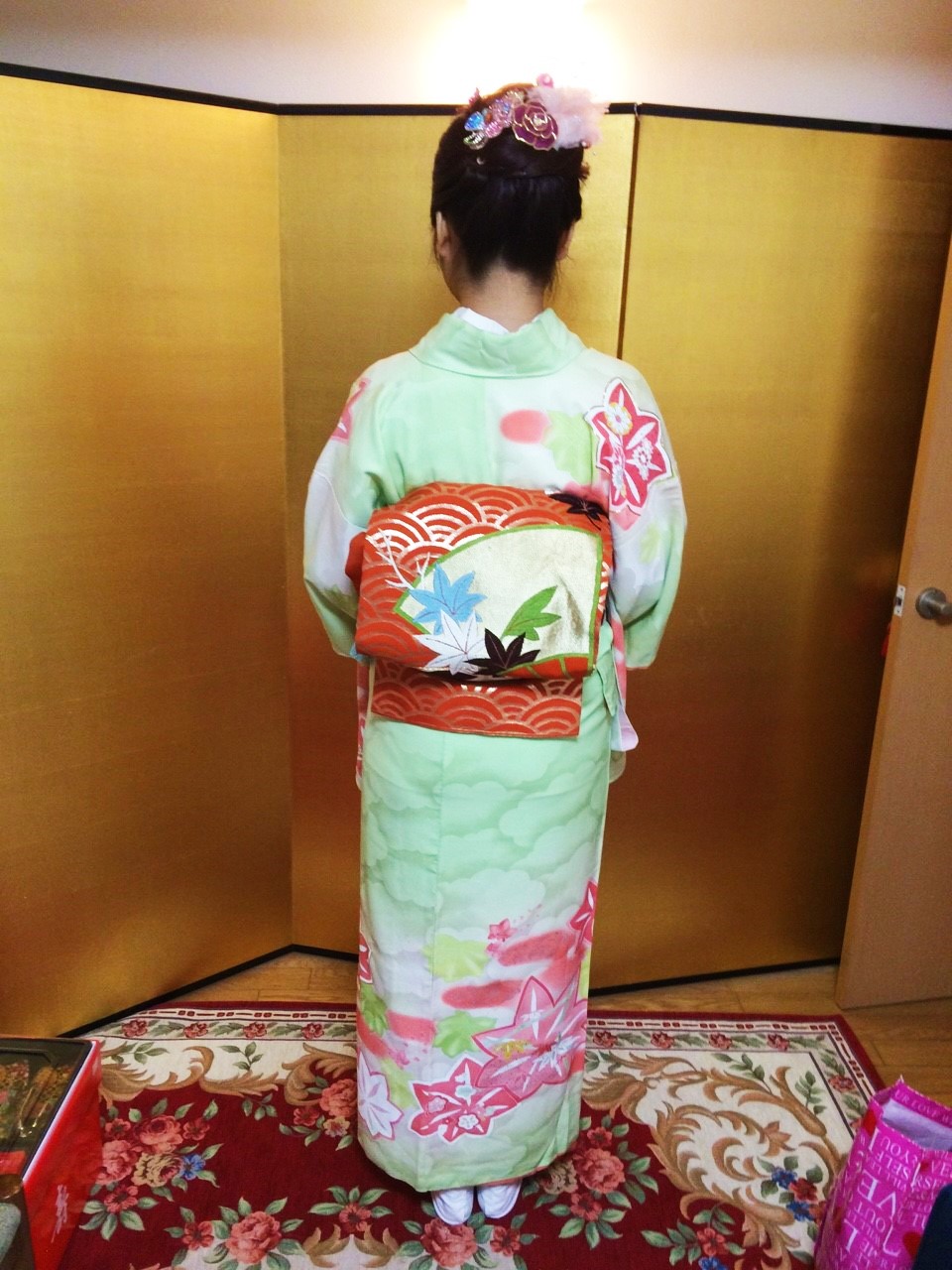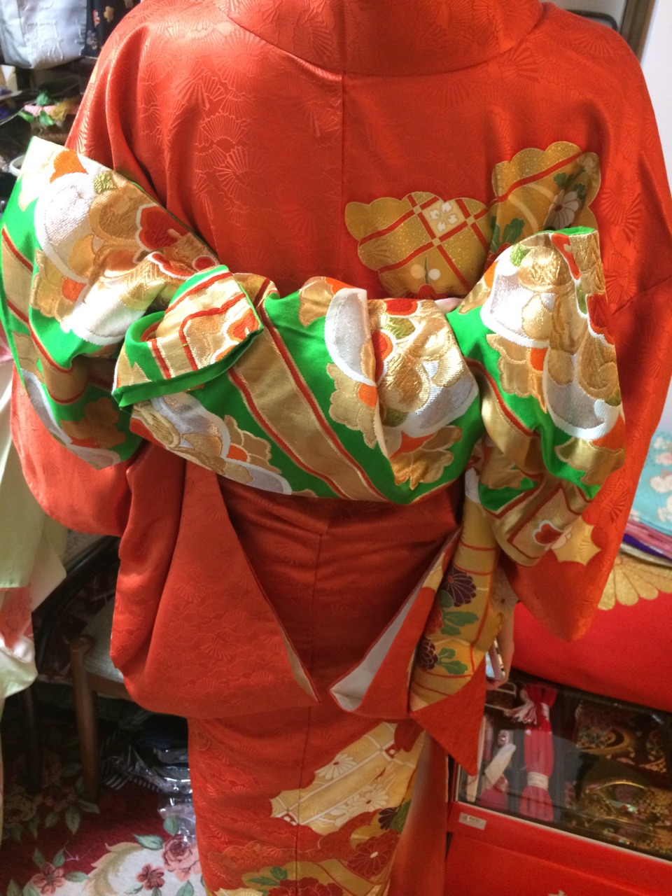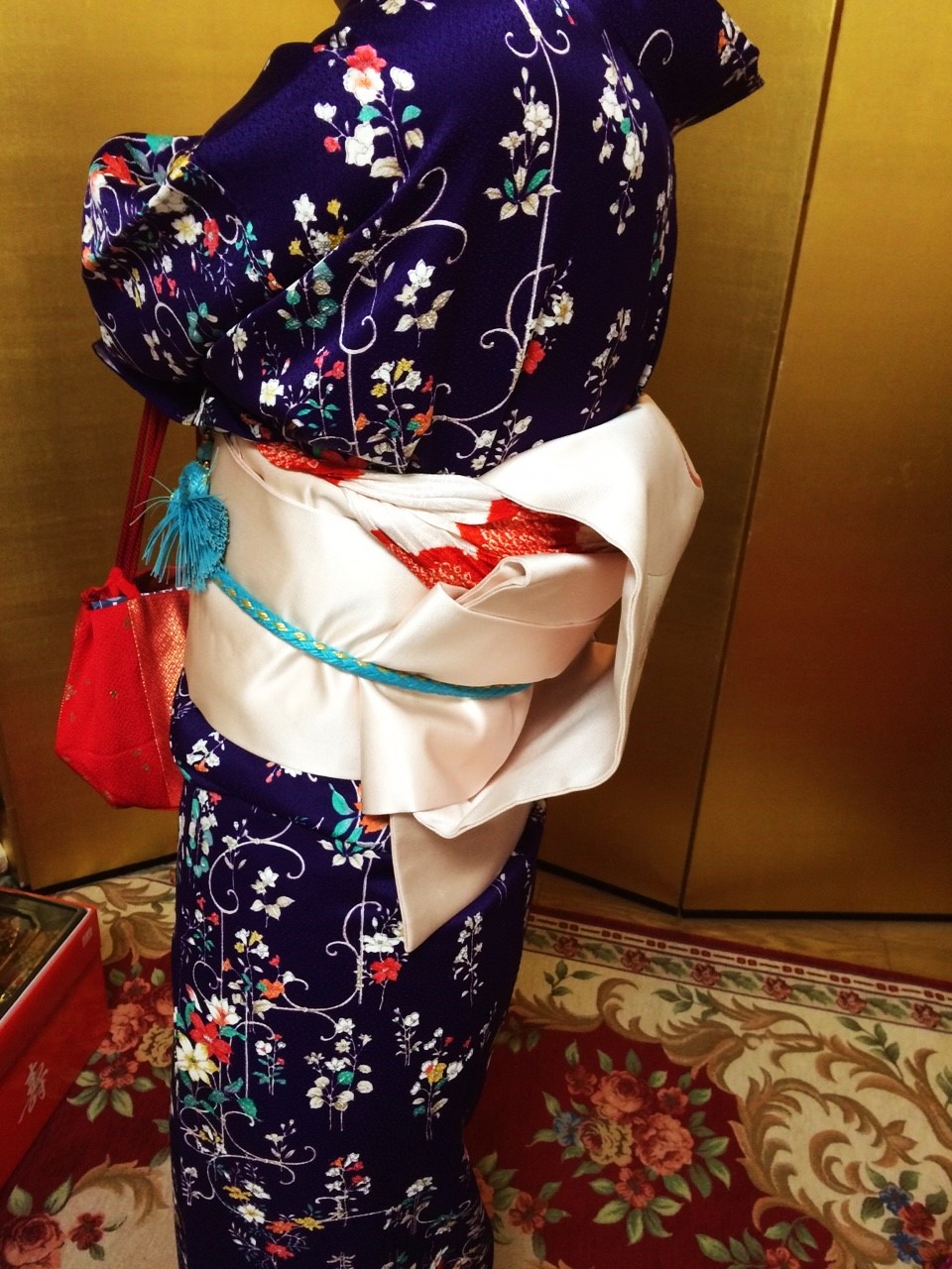 大家看看那厚厚的二重太鼓結,是婆婆一層一層的綁上,做工非常的細,簡直快到有點藝術的成分。(女性友人表示:勒超緊,感覺會瘦)