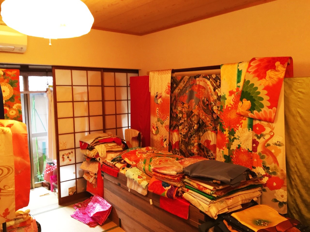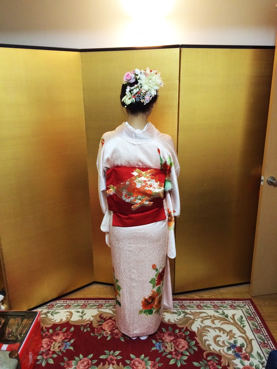 這是我們下一位客人的和服,她打得結查一下網路好像叫做文庫結,是江戶時代女性的基本結法,屬較高格調的款式。聽說要體驗文庫結也是要選價位較高(聽說一萬以上)的款式才有,但真的很漂亮。