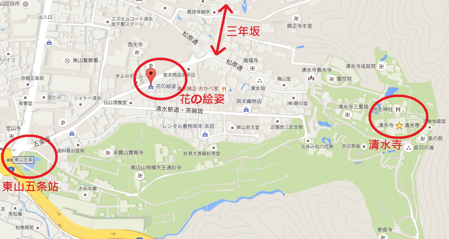 花の絵姿(花之繪姿)位於清水寺周邊,從京都車站出發的話搭乘市營206(公車資訊)到五条坂站(東山五条)下車即可。(請參考部落客小氣少年京都搭乘公車攻略與一日巴士卷介紹。