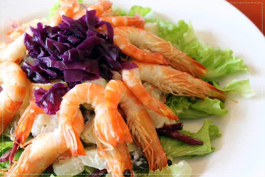第二道蝦沙拉料理看起來和吃起來,感覺就像西餐裡的前菜沙拉,但卻有中式料理給很多料的豪邁,下層是美生菜,中層是滿滿的馬鈴薯沙拉,外層則是肥美甜蝦加上口感脆脆的紫生菜,吃起來很清爽,不加調味的甜蝦更吃得出彈牙新鮮!
