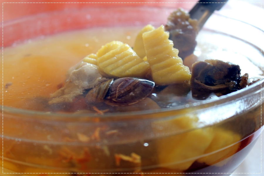 接著上來的這道湯品,港覺有點簡單又有點不簡單,喝起來很清淡中帶點清香,不像我自己煮的排骨湯會有油膩感,一問之下,原來湯裡小小細細的那叫”蟲草花”,會慢慢釋放出顏色,讓白色的山藥染成黃色的,有溫補的效果,喝起來有清甜的口感。山藥咬起來是脆的不是軟爛的口感,又是一道苗栗客家餐廳菜裡的推薦湯品哦!