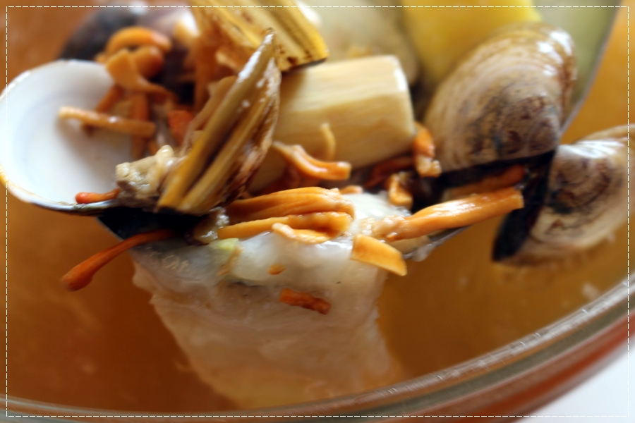 眼前這一鍋,吃起來感覺是濃郁爽口不油膩,那魚肉更是鮮美,還有鮮蝦、白菜和吃起來有脆感的魷魚及許多菇菇;金針菇、香菇、秀珍菇、火鍋料讓整桌人吃了真是大呼過癮!+讚不絶口!堪稱是鯉魚潭水庫美食第一啦!