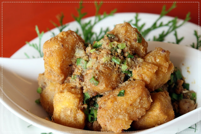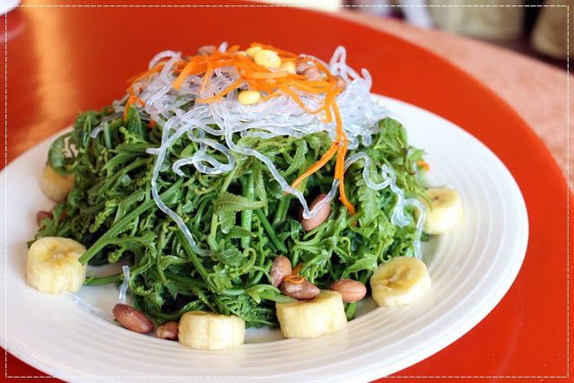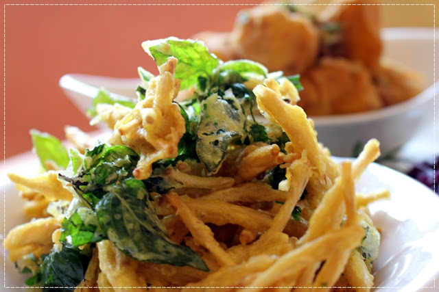因為大家的手腳都很快,幾乎一道菜上來一下子就秒殺,接著上的這兩樣炸物,一上桌我就先各夾一些,看起來以為是炸豆腐和炸牛蒡,錯!錯!錯!結果都不是!詢問之下才知道,以為是炸豆腐的這一盤其實是炸客家粿,外酥內軟,上頭還撒著鹹鴨蛋做的蛋黃酥,是道工夫菜呢!另一盤則是炸野薑花,我還是頭一次吃到這麼特別的菜呢!真是間道地的三義美食餐廳才會有的菜色!