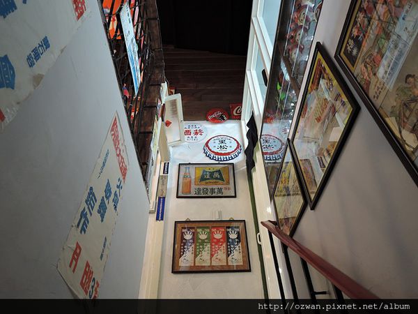 沿著紅塑膠把手與磨石子樓梯往上爬,兩側是復古雜貨海報。